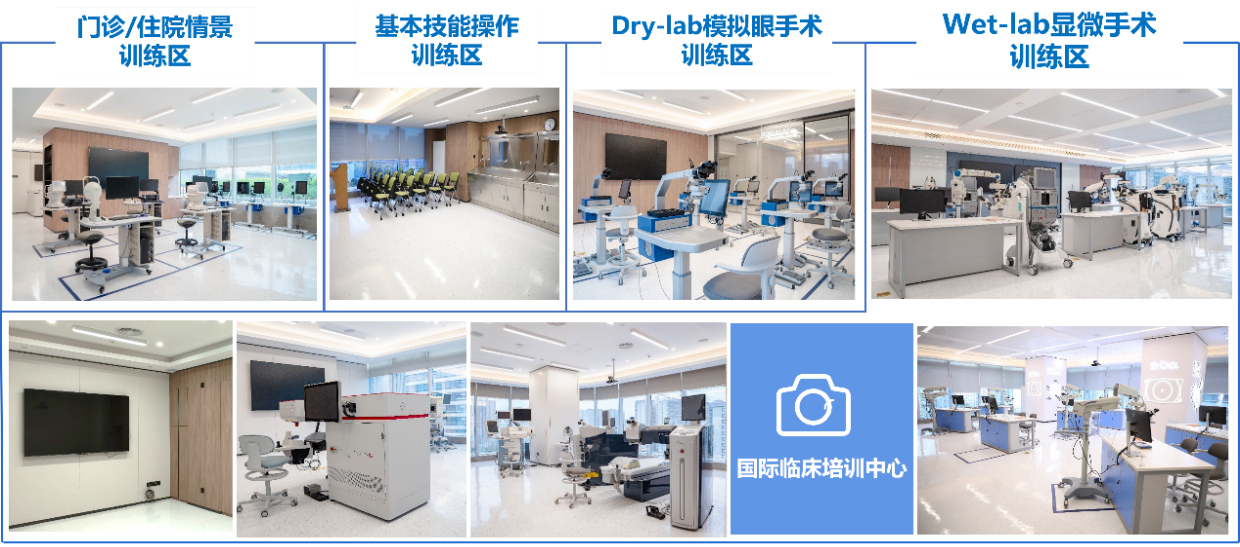 AICTC設置了“門診/住院情景訓練區”、“基本技能操作訓練區”、“Dry-lab模擬眼手術訓練區”、“Wet-lab顯微手術訓練區”四個培訓功能區共8個lab,可實現以超聲乳化、飛秒白內障、玻璃體切除、準分子激光、全飛秒、ICL、角膜移植等眼科亞專科手術培訓為核心,以眼科基本檢查與技能訓練為輔的全方位教學。