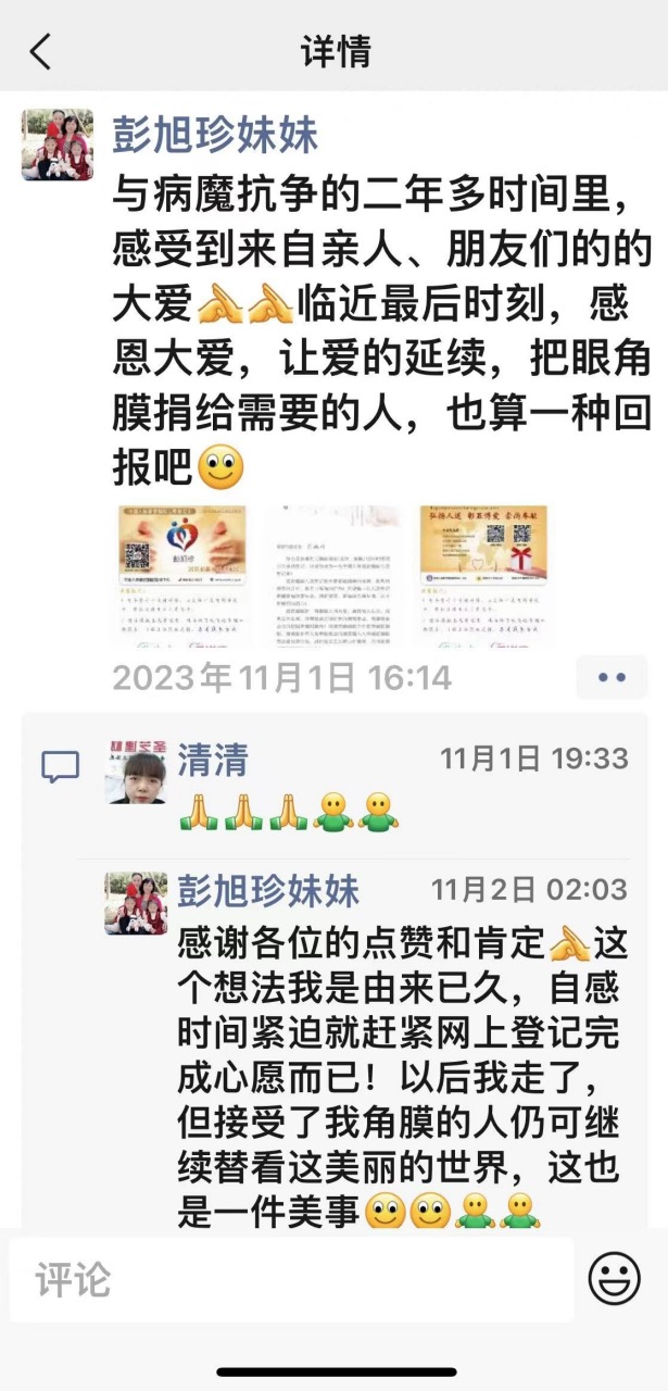 今年10月24日,說話已經非常吃力的彭旭珍拜托哥哥幫她聯系辦理角膜捐獻登記。由于不了解捐獻途徑,一周后經過多方打聽,終于聯系上湖南省紅十字角膜捐獻愛爾眼科接收站咨詢捐獻事宜。11月1日在中國人體器官捐獻平臺完成登記,并寫下人生最后一條朋友圈:“與病魔抗爭的二年多時間里,感受到來自親人、朋友們的大愛,臨近最后時刻,感恩大愛,讓愛延續,把眼角膜捐給需要的人,也算一種回報”,并配上一張她引以為傲的中國人體器官捐獻志愿登記卡照片。